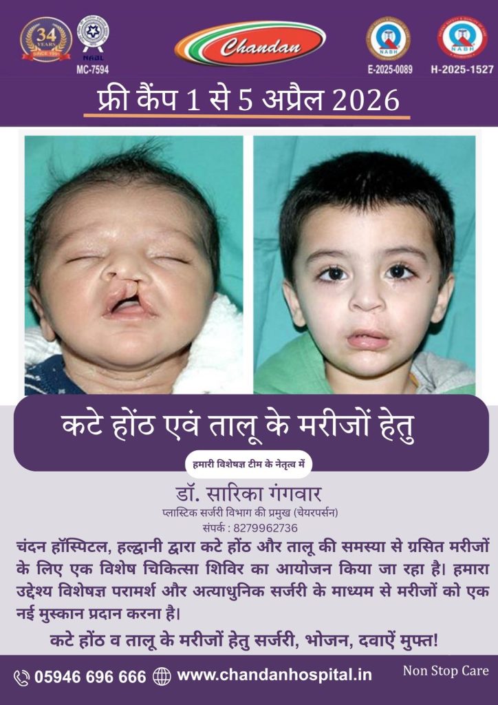 हल्द्वानी,। हिंदी न्यूज़ उत्तराखंड के हल्द्वानी स्थित चंदन हॉस्पिटल द्वारा 1 से 5 अप्रैल 2026 तक कटे होंठ एवं तालू (क्लेफ्ट लिप एवं पैलेट) से पीड़ित मरीजों के लिए निःशुल्क सर्जरी शिविर आयोजित किया जा रहा है। यह पहल न केवल इलाज उपलब्ध कराने का प्रयास है, बल्कि समाज में इस बीमारी को लेकर फैली भ्रांतियों को दूर करने और जागरूकता बढ़ाने की दिशा में भी एक महत्वपूर्ण कदम मानी जा रही है।